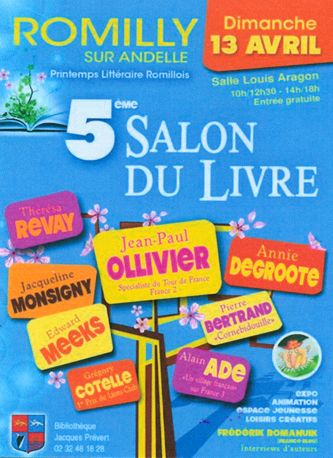 Je suis invité le dimanche 13 avril au 5ème Salon du livre, à Romilly sur Andelle, dans l’Eure, salle Louis Aragon. (Tu n’en reviendras pas toi qui courais les filles/ Jeune homme dont j’ai vu battre le cœur à nu/Quand j’ai déchiré ta chemise et toi non plus/Tu n’en reviendras pas vieux joueur de manille/Qu’un obus a coupé par le travers en deux/Pour une fois qu’il avait un jeu du tonnerre/Et toi le tatoué l’ancien légionnaire/Tu survivras longtemps sans visage sans yeux. Magnifique texte d’Aragon dédié aux Poilus de la Grande Guerre et mis en musique par Léo Ferré) Je dédicacerai les quatre premiers volumes du Village français. Je participerai à 15h30 à un salon littéraire animé par Fred Romanuik, de France Bleu Haute-Normandie. L’affiche ci-dessous vous renseignera sur quelques-uns des auteurs présents. Venez nombreux !