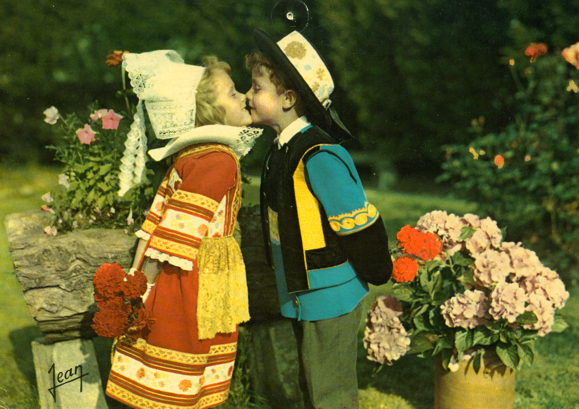 Encore des gamins en costume folklorique ! me direz-vous. C’est que, dans ma famille, l’exotisme régional a eu longtemps, de toute évidence, un charme puissant. Je ne me souvenais pas que c’était à ce point. Ce 3 juillet 1963, ma marraine, Henriette, et sa sœur, Germaine, sont en Bretagne. Les costumes sont de Fouesnant et Bénodet (Finistère). Les décors ne sont pas de Roger Hart…