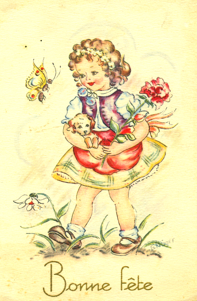 Le 9 septembre est le jour de ma fête. Je sais que nous sommes le 25, mais je viens juste d’avoir l’idée… Quand j’étais enfant, c’était l’occasion d’échanger des cartes postales. Dans le genre « portrait », voici un exemple de celles que m’envoyaient ma grand-mère et sa fille aînée, la gentille tante Denise,