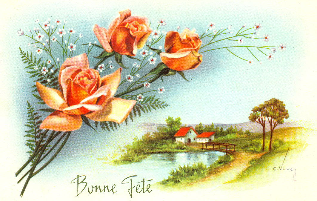 Dans le genre « paysage », voici un exemple de celles que m’envoyait ma marraine. Dans les deux cas, les jolies fleurs et la vie insouciante semblent avoir la préférence. Dans la vie réelle, c’était un peu moins bucolique, évidemment. Ma grand-mère a élevé neuf enfants et ma marraine a fait des ménages