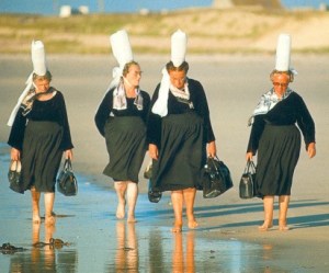 Les gilets jaunes, les gilets jaunes, d’accord, mais les coiffes blanches, hein ? Ça, on n’en parle jamais ! Ça n’intéresse personne ? Pourtant elles manifestent elles aussi, comme ici sur la plage de Quiberon, en 2005. Et les pieds nus, en plus !